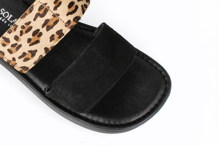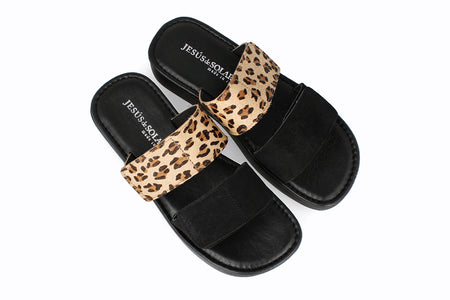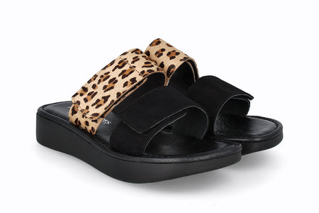 Sandalia de piel color negro con animal print, 4 cm de taco.