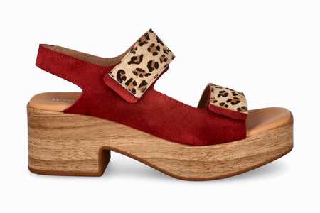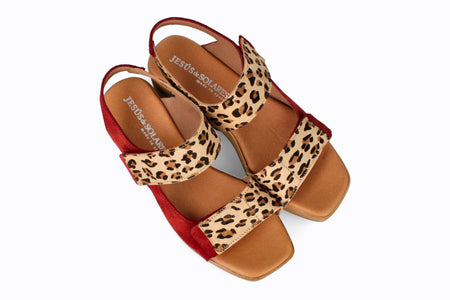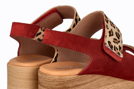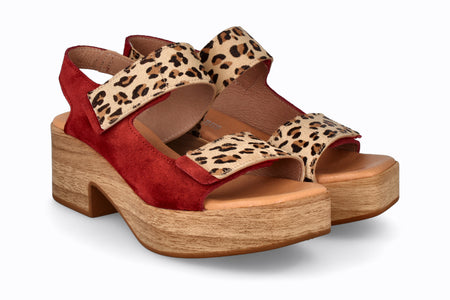 Sandalia de piel color rojo con animal print, 5 cm de taco