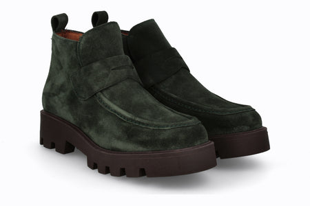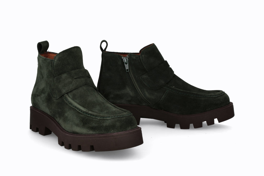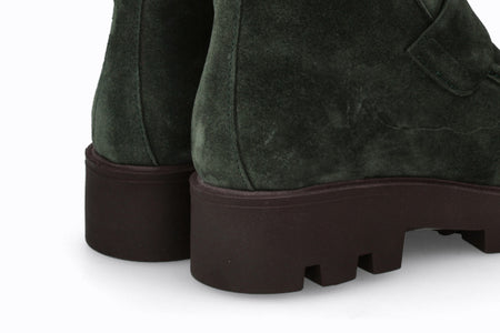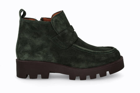 Botín de cuero tipo gamuza, color verde musgo con suela de goma.