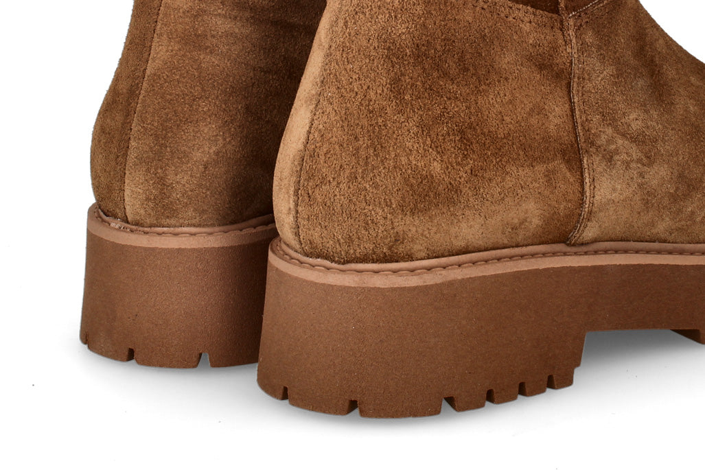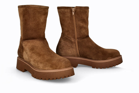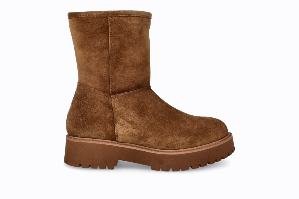 Botín de cuero tipo gamuza, color marrón con suela de goma.