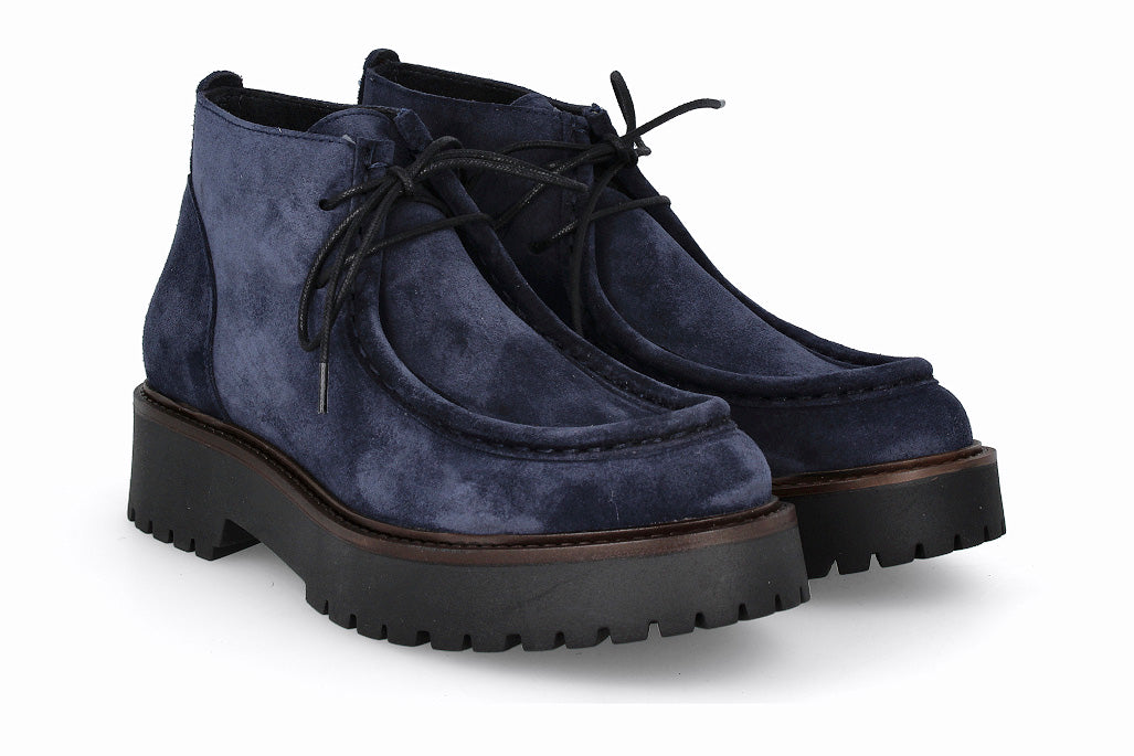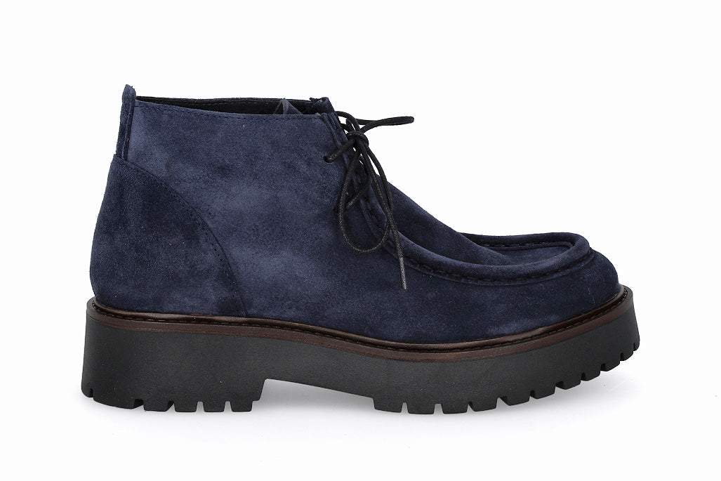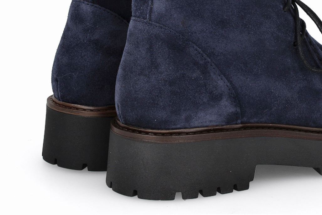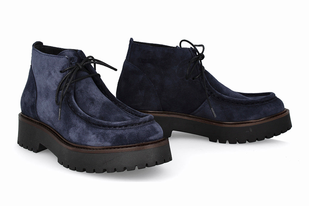 Botín de cuero tipo gamuza con cordones, color marino con suela de goma.
