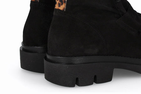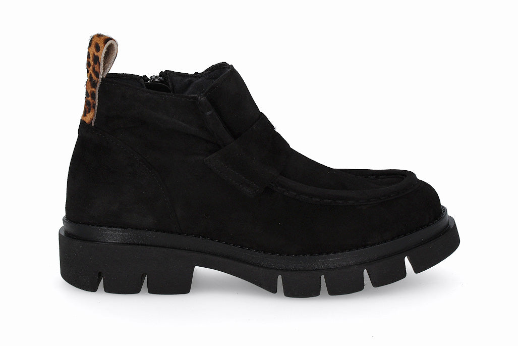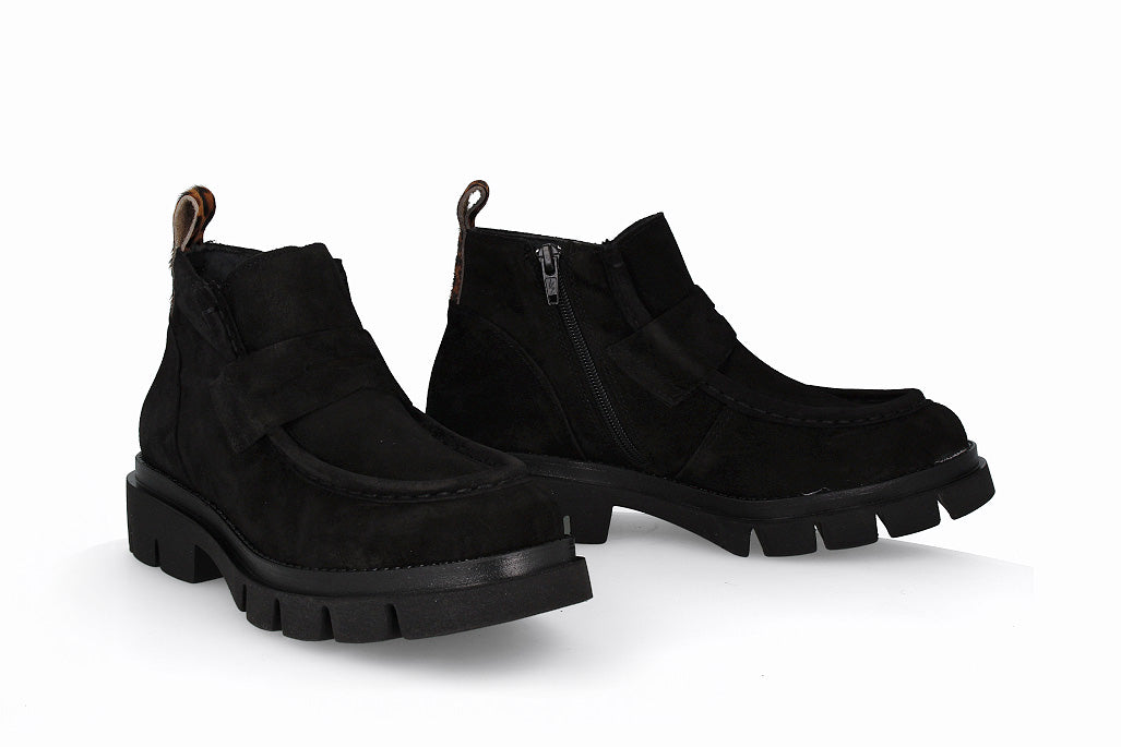 Botín de cuero tipo gamuza, color negro con suela de goma.