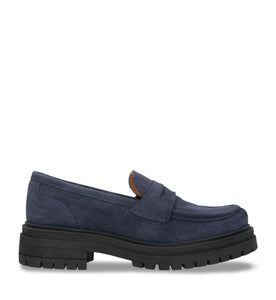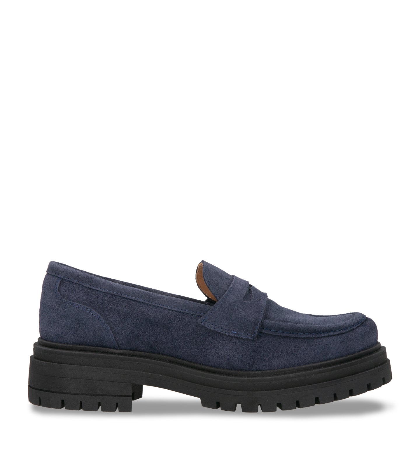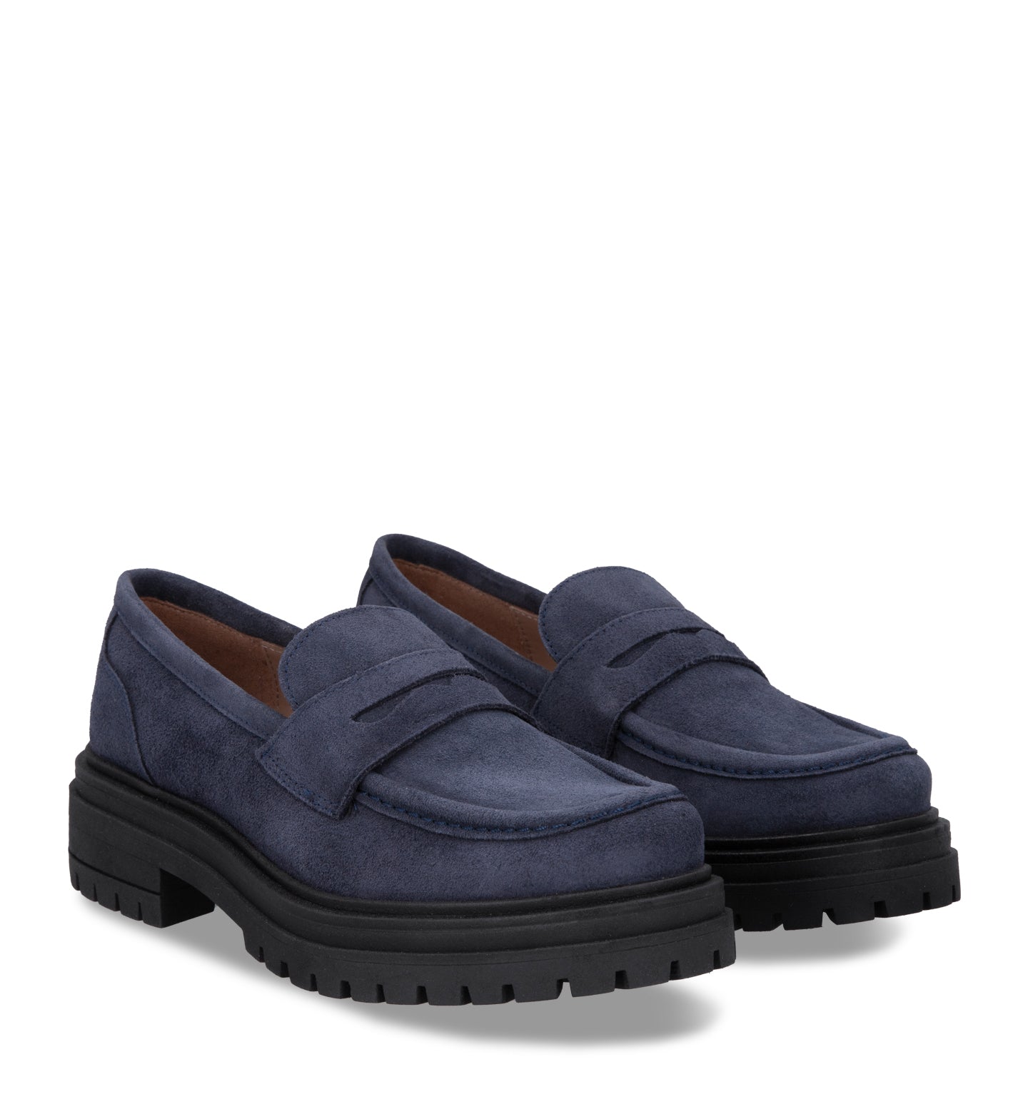 Mocasín de cuero tipo gamuza, color azul marino con suela de goma.