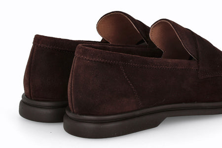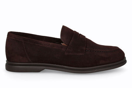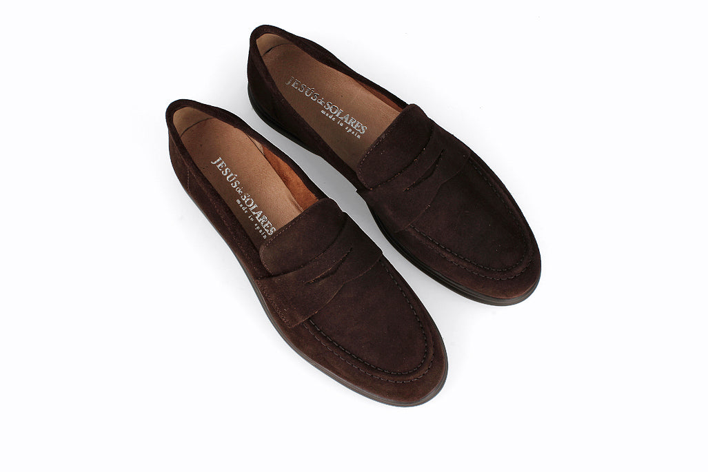 Mocasín de cuero tipo gamuza, color marrón con suela de goma.