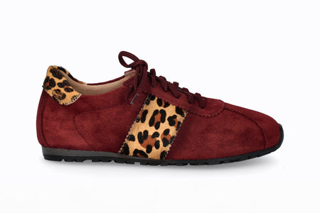 Zapatillas de cuero tipo gamuza con cordones, color burdeos con suela de goma.