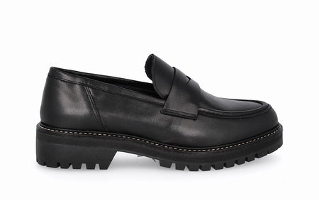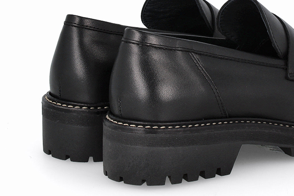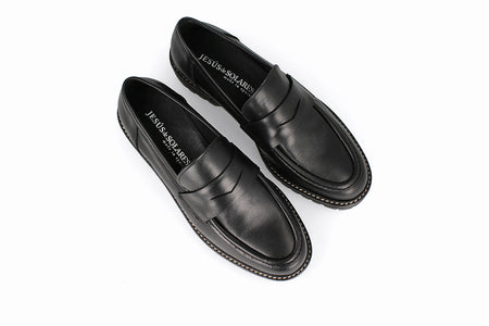 Mocasín de cuero, color negro con suela de goma.