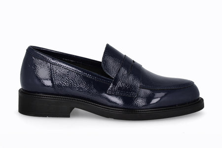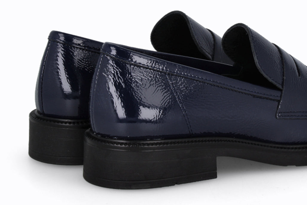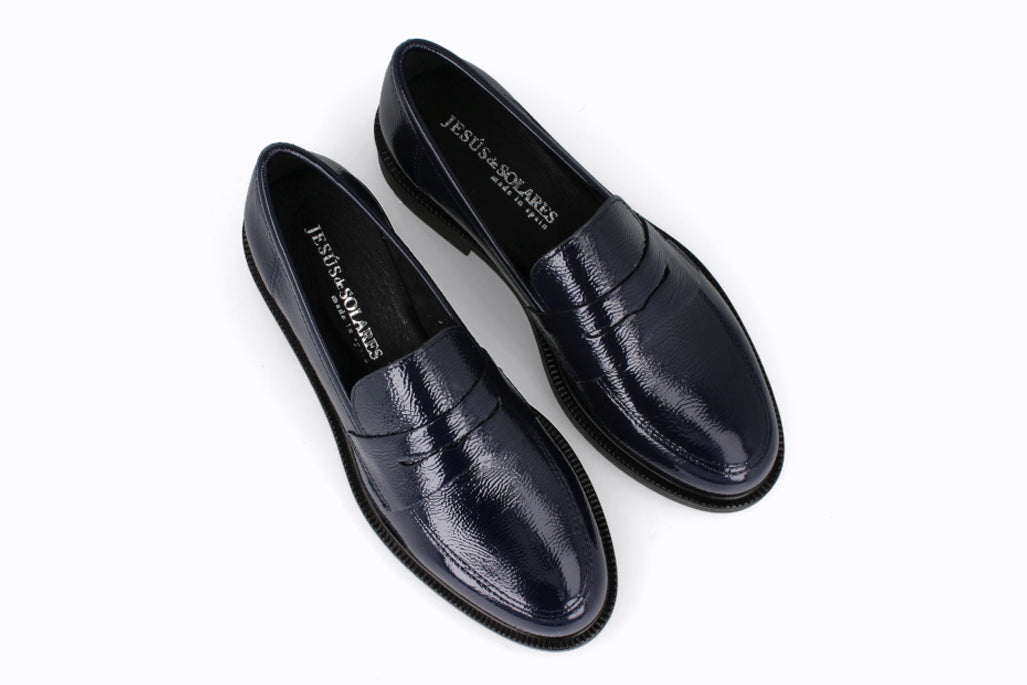 Mocasín de cuero tipo charol, color negro con suela de goma.