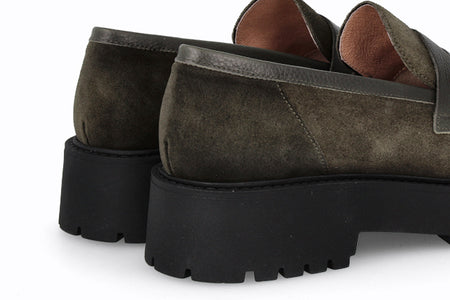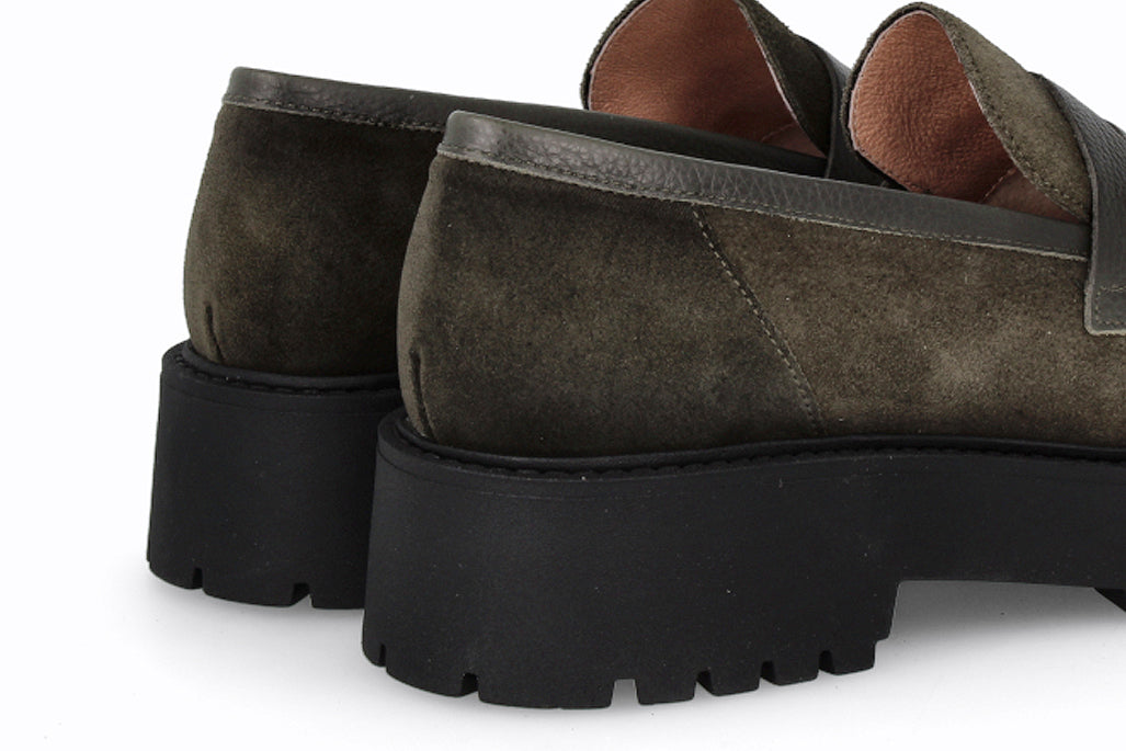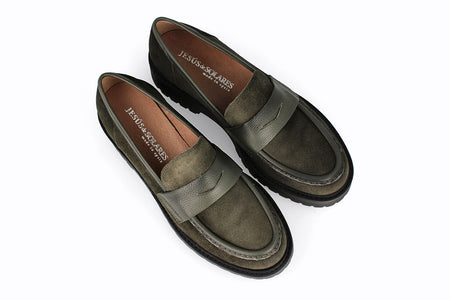 Mocasín de cuero tipo gamuza, color verde musgo con suela de goma.
