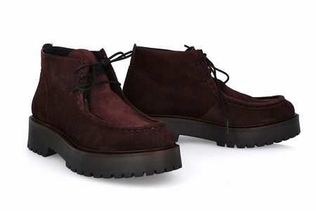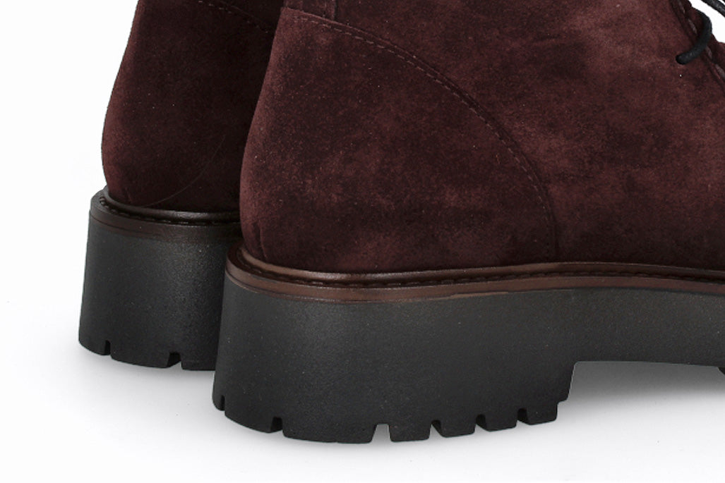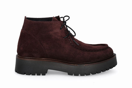 Botín de cuero tipo gamuza con cordones, color burdeos con suela de goma.