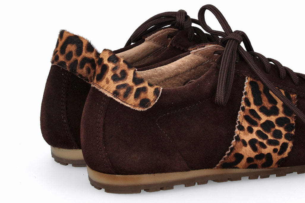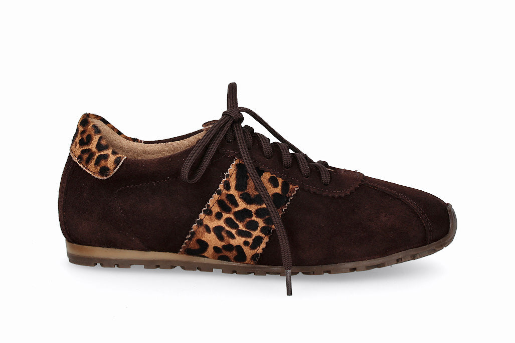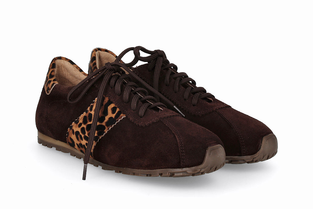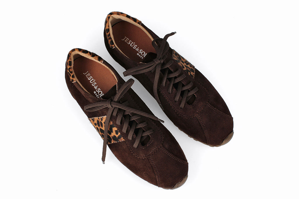 Zapatillas de cuero tipo gamuza con cordones, color marrón oscuro con suela de goma.