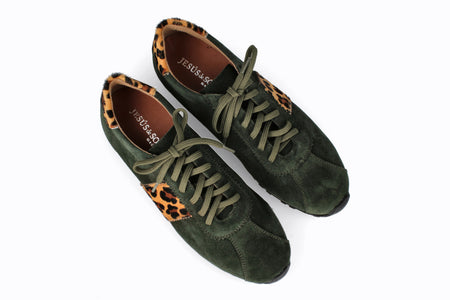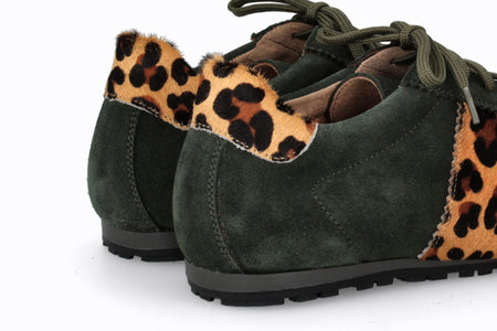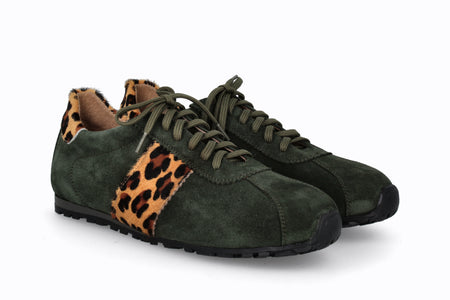 Zapatillas de cuero tipo gamuza con cordones, color verde musgo con suela de goma.