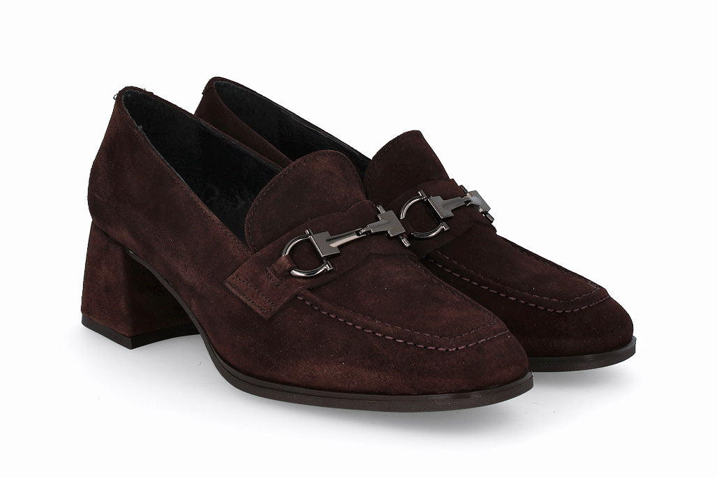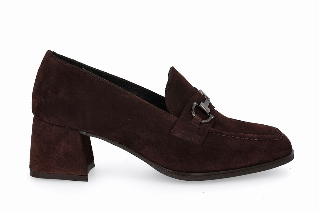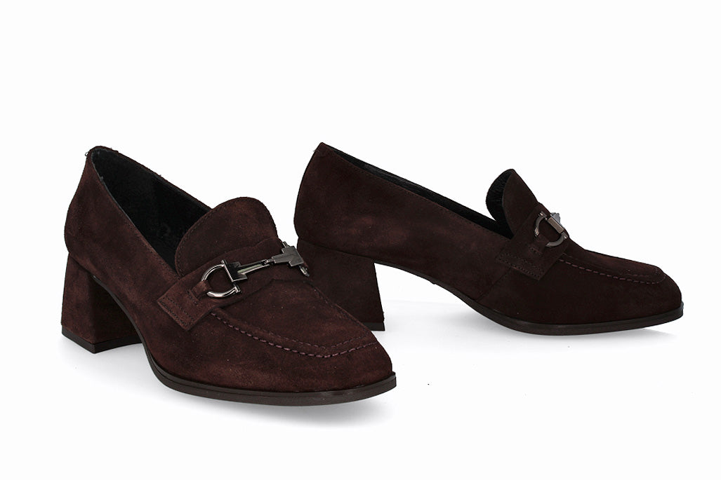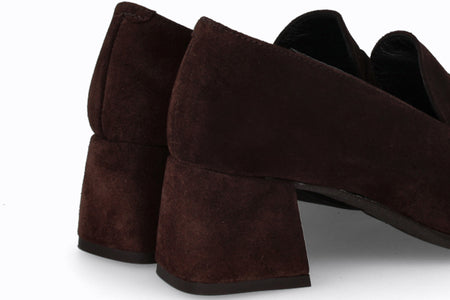 Zapato de cuero tipo gamuza, color marrón con suela y taco de 4cm.