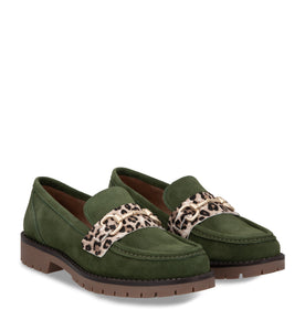 Mocasín de cuero tipo gamuza, color verde musgo con suela de goma.