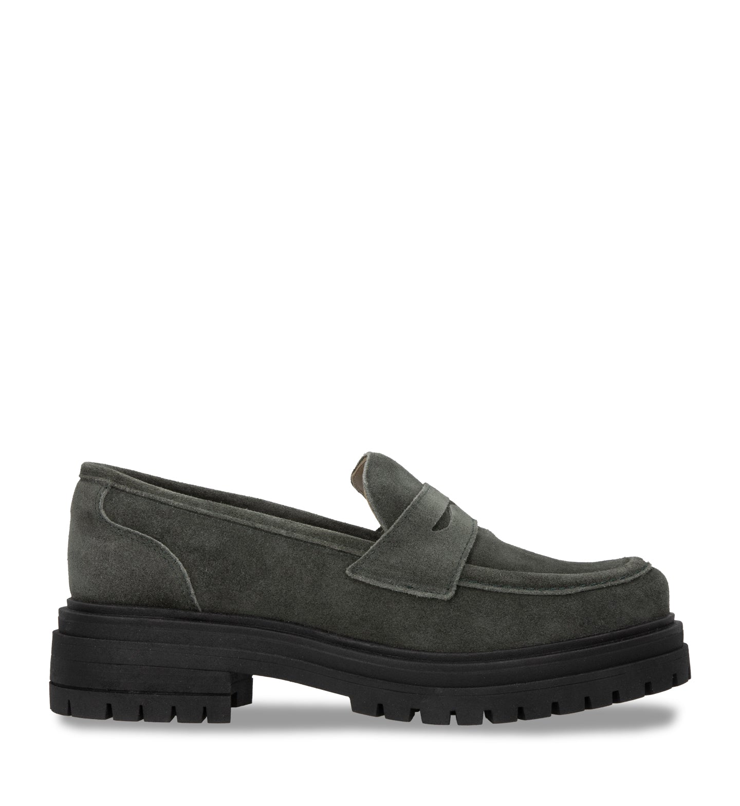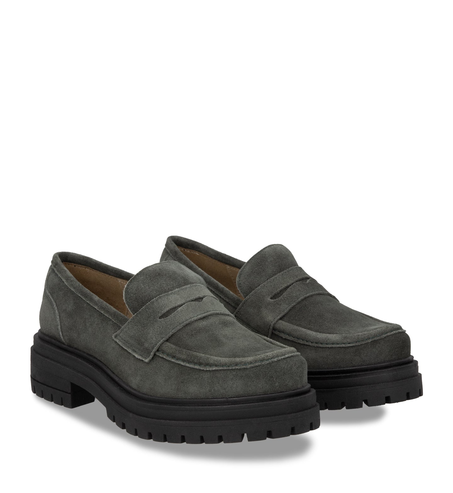 Mocasín de cuero tipo gamuza, color verde musgo con suela de goma.