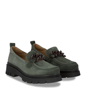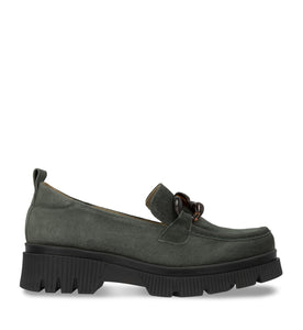 Mocasín de cuero tipo gamuza, color verde musgo con suela de goma.