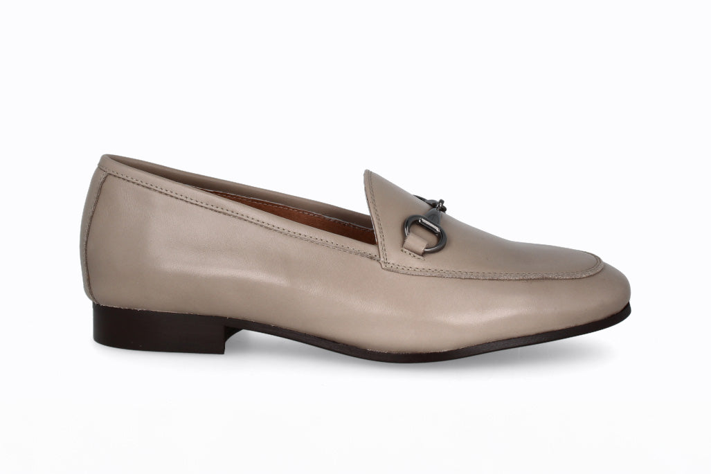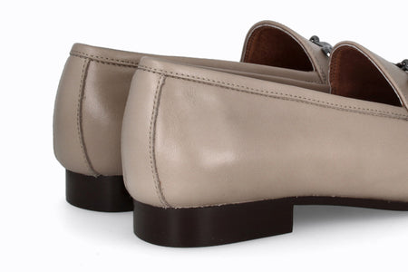 Mocasín de cuero, color taupe con suela de goma.