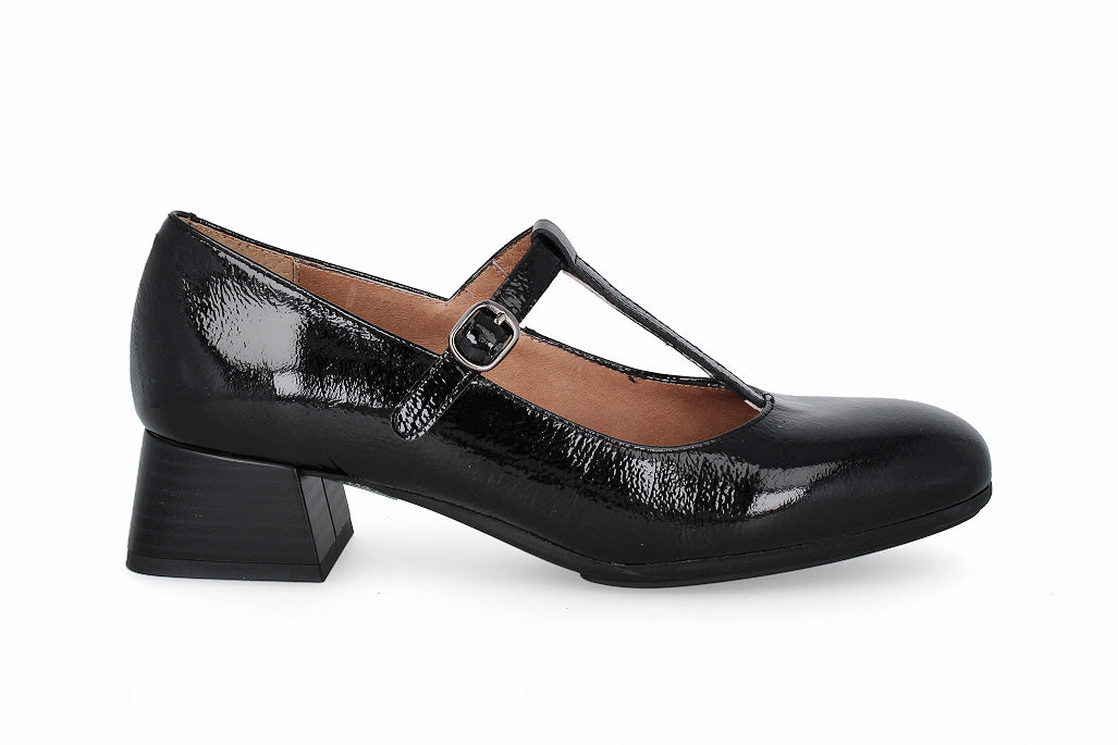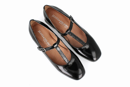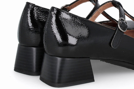 Zapato de cuero tipo charol, color negro y con taco de 5cm.