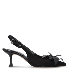 Zapato de piel color negro con flor de charol en el mismo tono, 7cm de taco